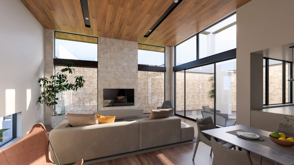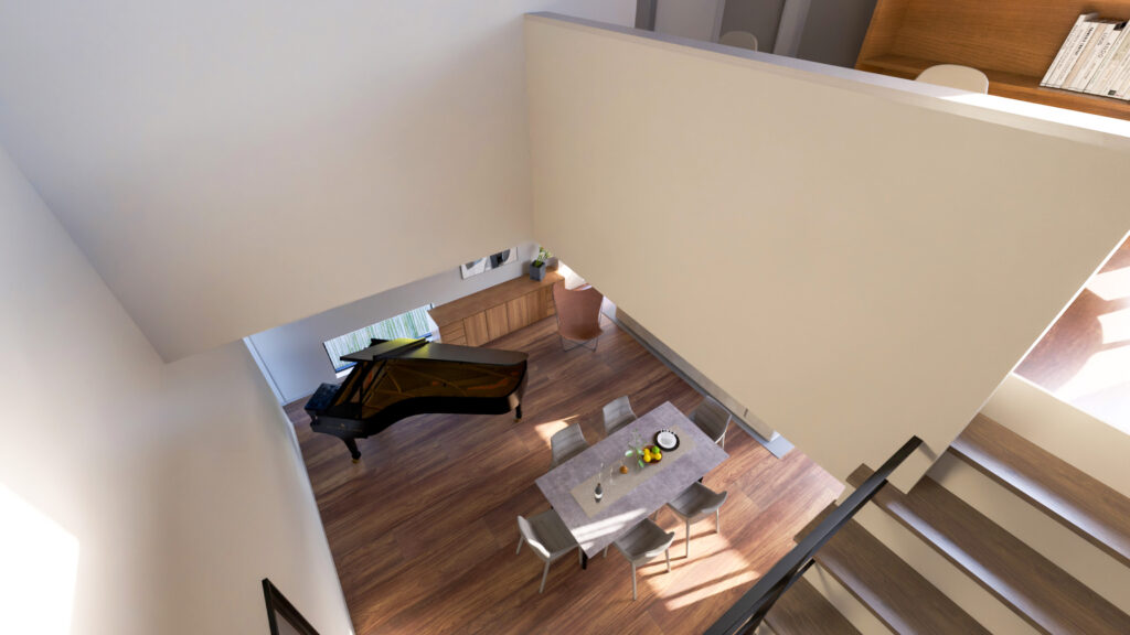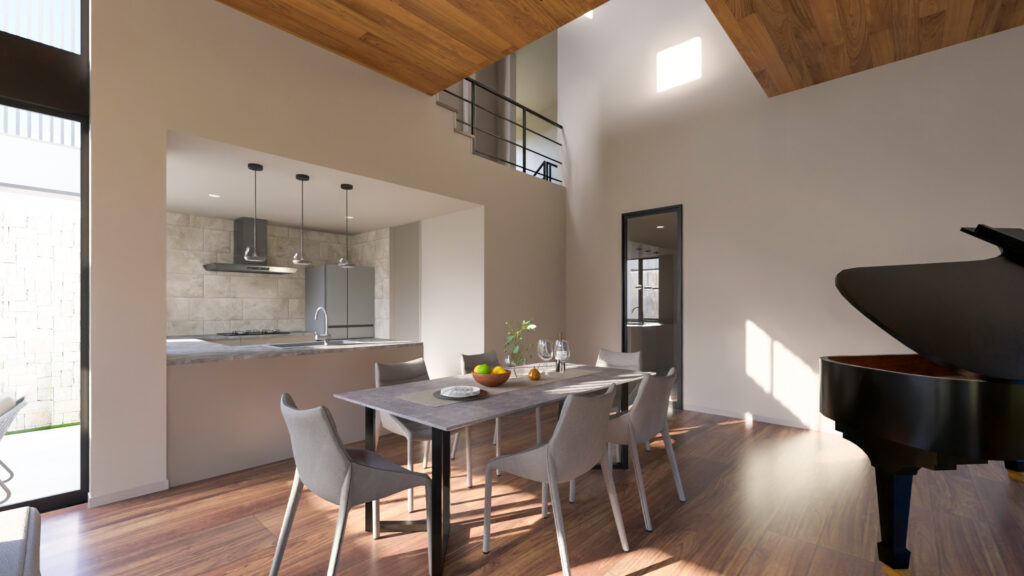 1階のLDKは天井高を約3,800mm確保し、さらに2階へとつながる吹き抜けを設けています。