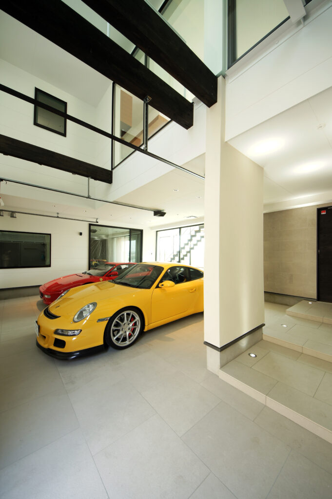 1階に設けられたガレージは、単なる駐車スペースではなく、趣味と交流のための場として計画された空間です。