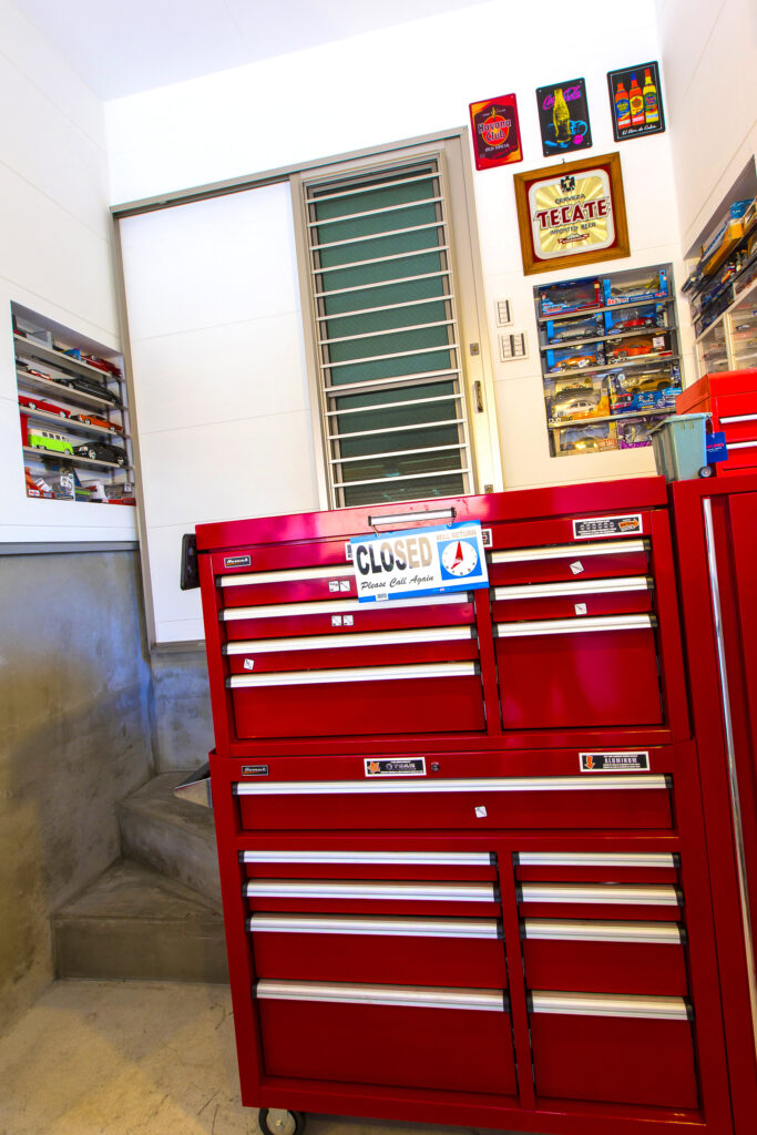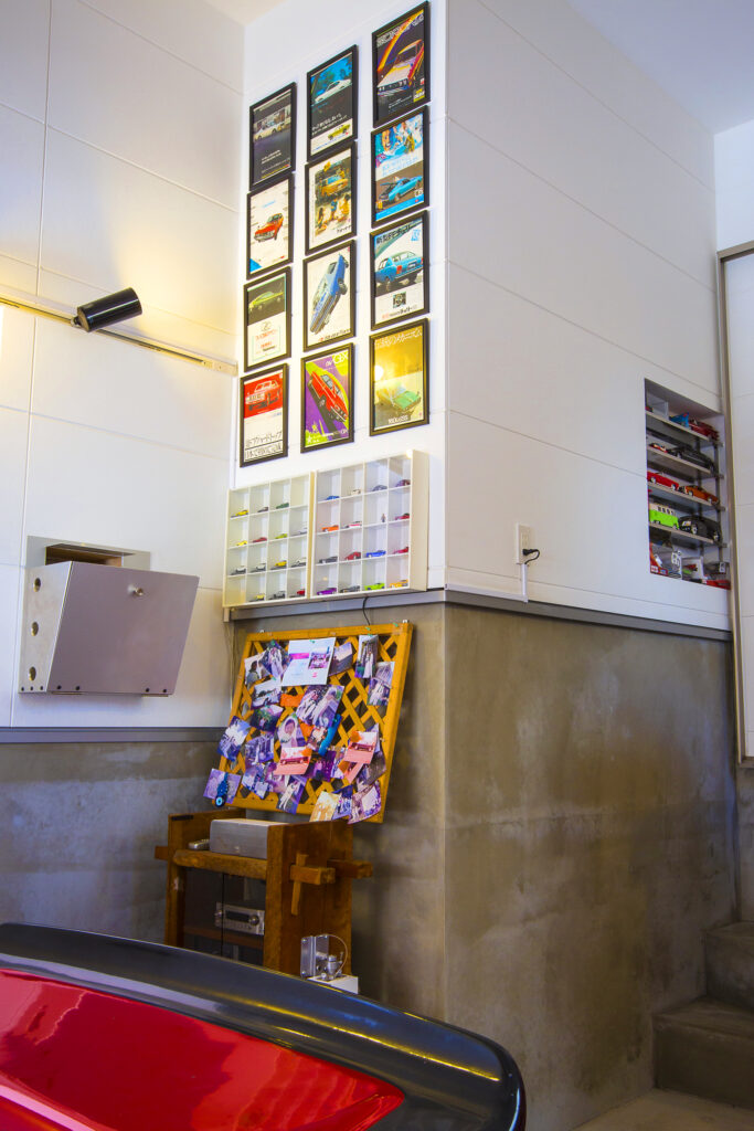 ミニカーのディスプレイやポスター、ツールの配置まで含めて、空間全体が「西海岸風」のひとつの世界観を表現しています。