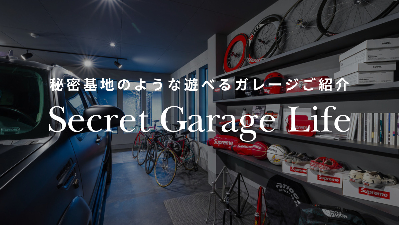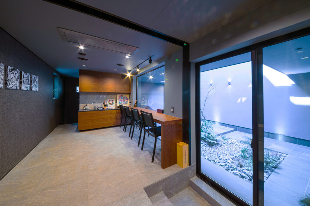 車を停めるための場所という用途を超えて、趣味や交流の時間を楽しむ「秘密基地」として計画されたこのガレージ。
