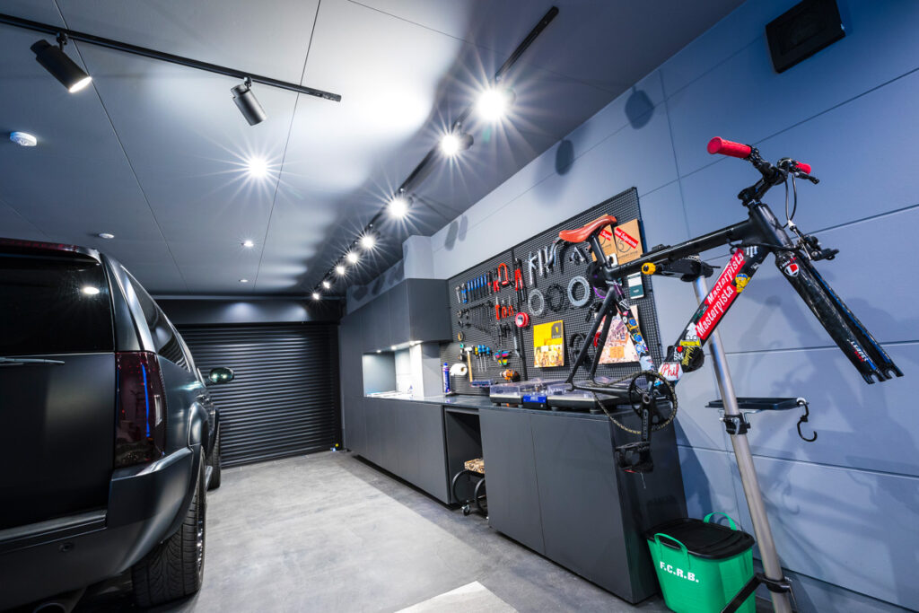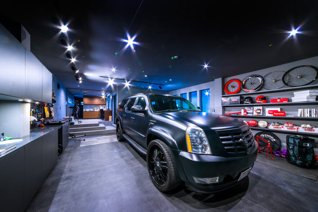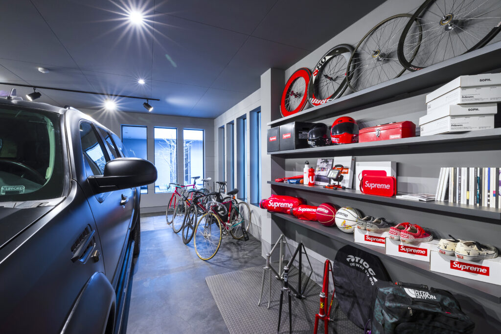 このガレージの特徴は、車を停めるだけでなく、オーナーの趣味である自転車のためのスペースがしっかりと確保されていること、奥に「愛車と過ごすための場所」があることです。