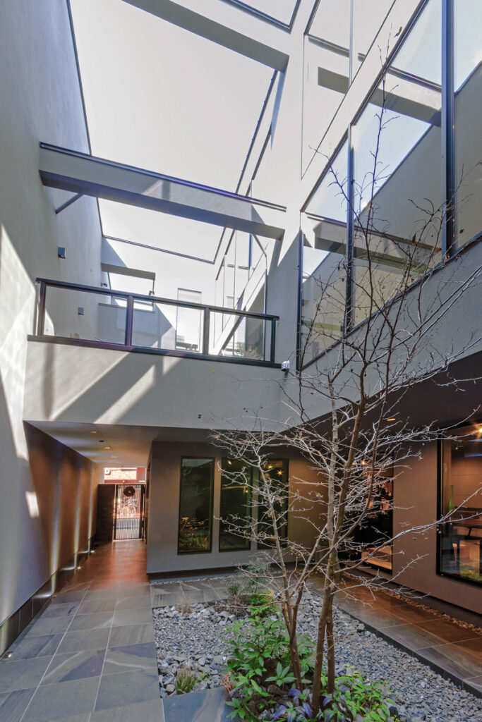 ガレージに隣接するアプローチは、玄関へと続く動線でありながら、中庭のように使える屋外空間としても計画されています。