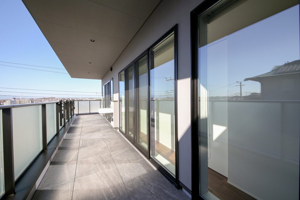 2階の和室、廊下に面した長いバルコニー。眺望を愉しめるほか、1階から目につきづらく寝室や子ども部屋から近い位置にあるため、布団を干すにも便利です。