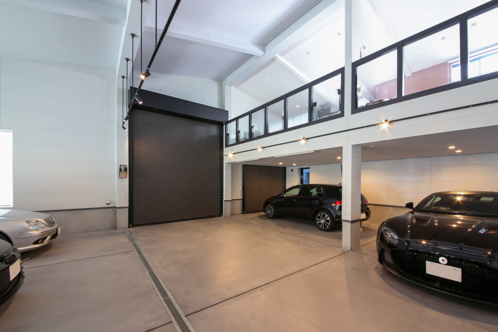 車5台とキャンピングカーを収めるために計画された、大空間ガレージ。