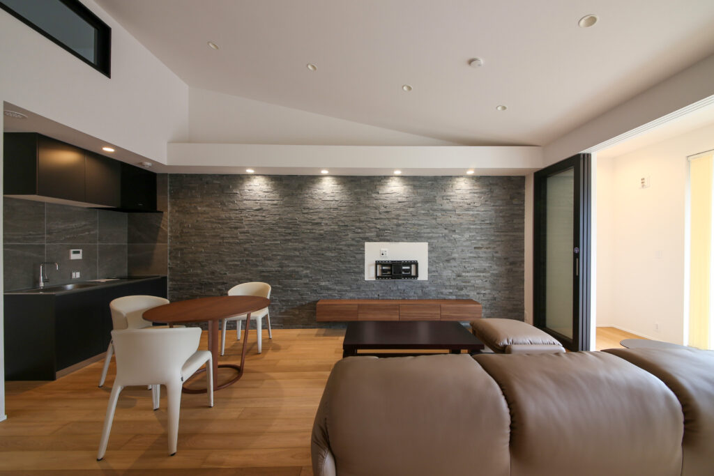 勾配天井と石壁がつくる和モダンのリビングダイニング
