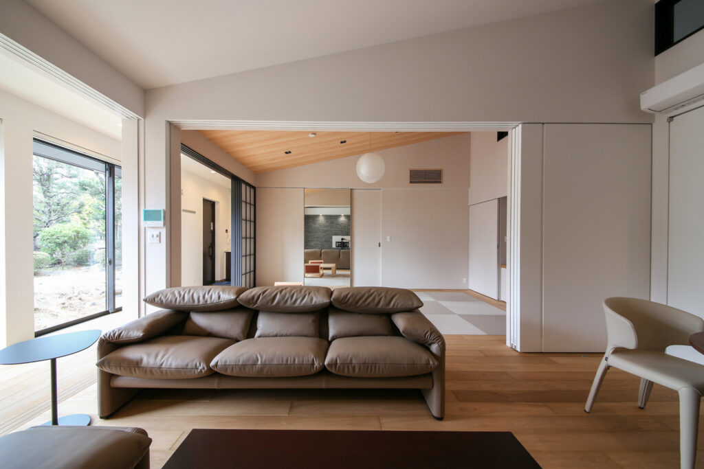 カッシーナの家具を合わせたリビングは、可動式の背もたれによって、和室とのつながりやくつろぎ方にも柔軟に応えます。