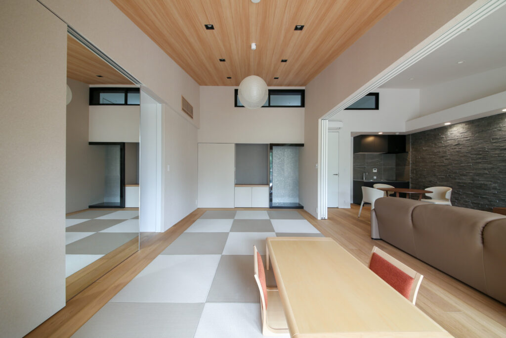 床の間と仏壇置き場は横並びに構成し、仏壇は引き戸で隠せる設えに。琉球畳の周囲には縁甲板を回し、リビングと連続する一体的な空間に仕上げています。