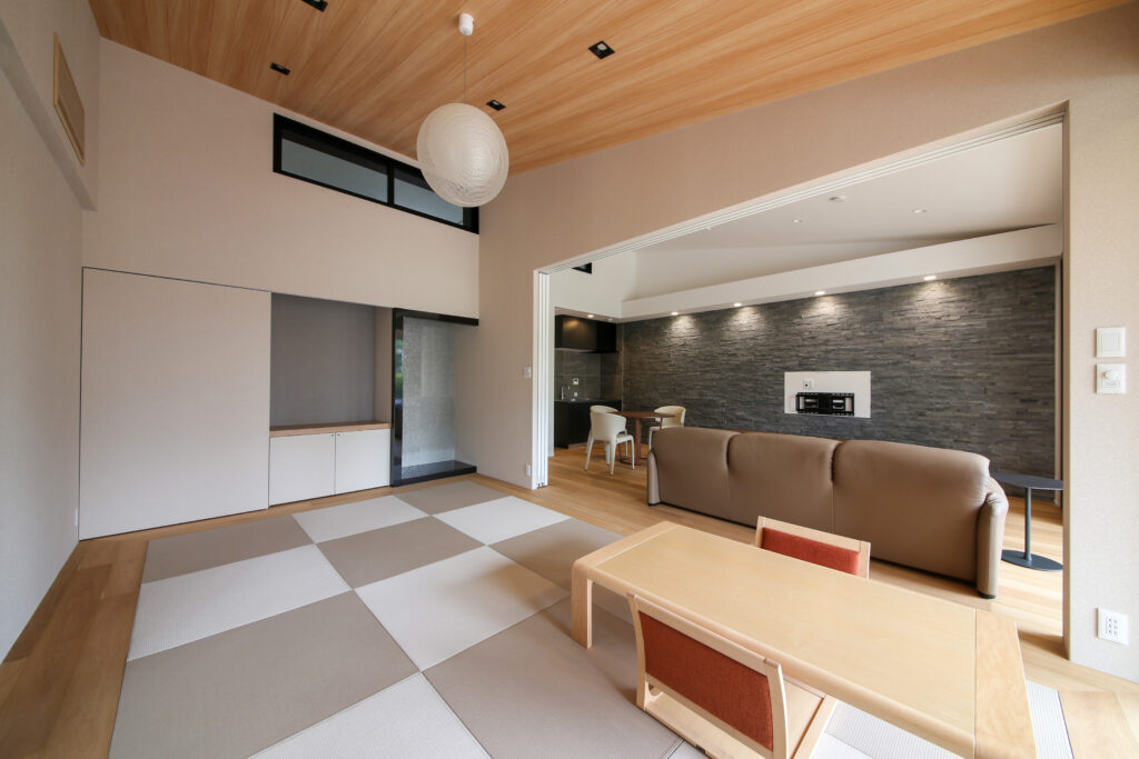 リビングは屋根勾配を活かした天井と素材の表情で、和の趣と広がりをつくり出しています。