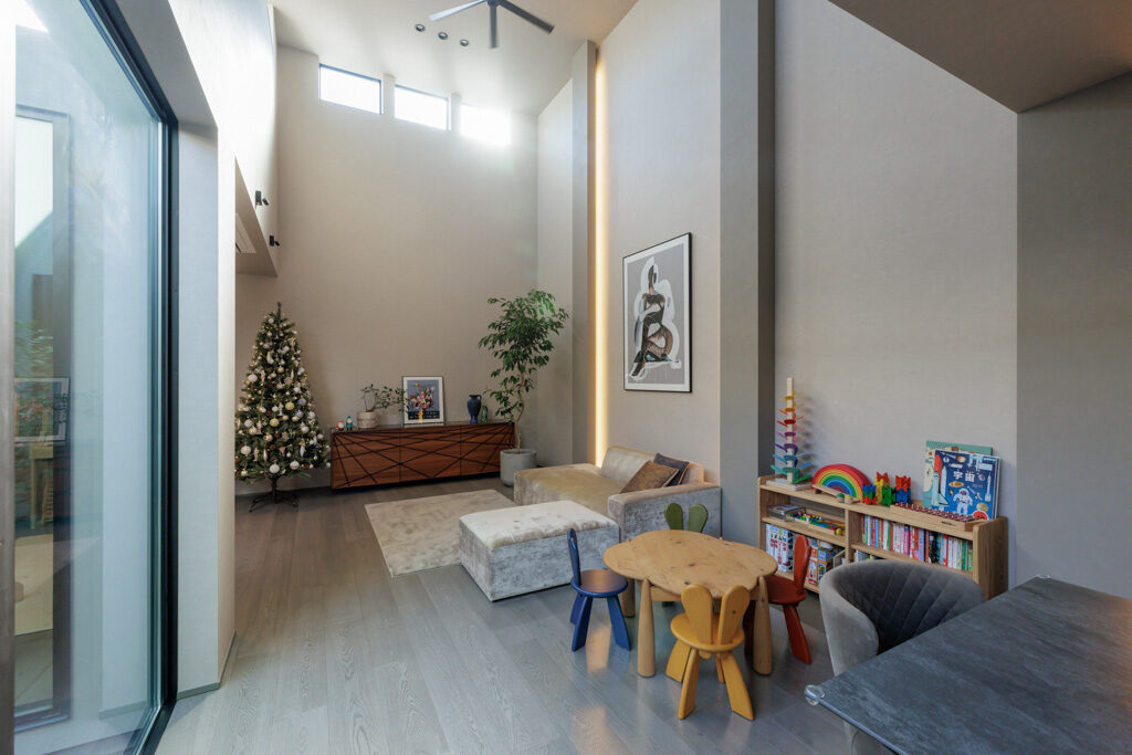 タイルとウォルナットで彩る落ち着きのあるリビング